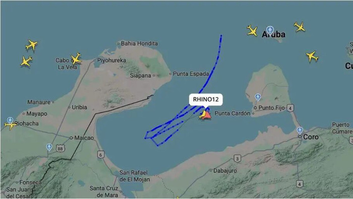 FlightRadar24等网站显示,美国战斗机留下的飞行轨迹表明,它们在委西北部的马拉开波湖北部上空飞行,飞越委内瑞拉湾水域,飞行路线位于委内瑞拉两个能源产业关键地区——苏利亚州的拉瓜希拉市和法尔孔州首府科罗市之间。